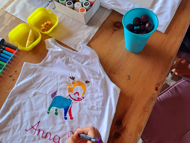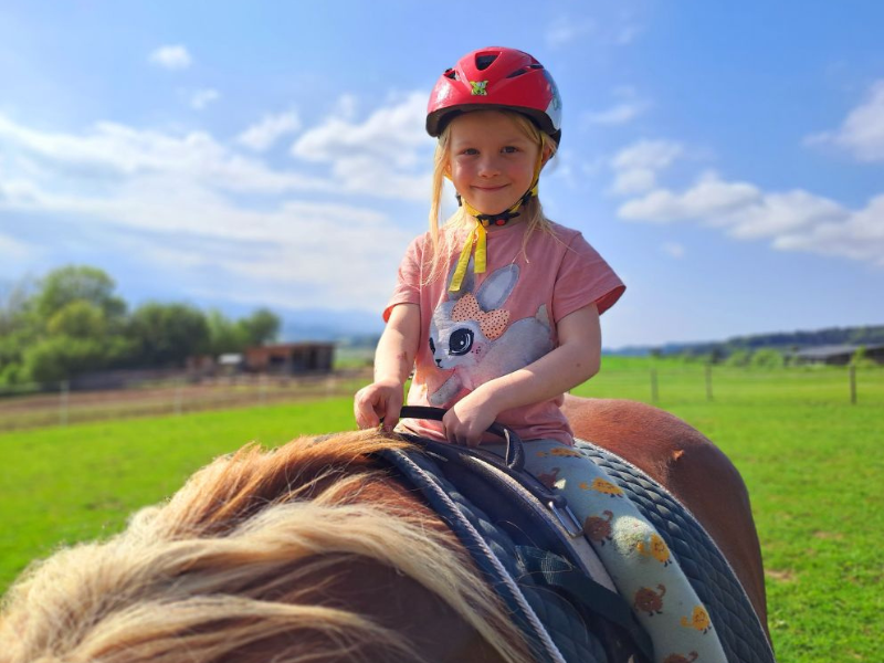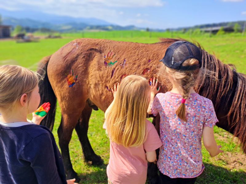 Die Kinder versorgen Tiere am Hof, bewegen sich viel im Freien, basteln, spielen und erleben Pferde beim Putzen, Schmücken und geführten Reiten. Gemeinsam kümmern wir uns um unsere Hoftiere – Pferde, Nandus, Ziegen, Schafe, KuneKune-Schweine und Katzen – und lernen dabei den achtsamen Umgang mit Tieren kennen.